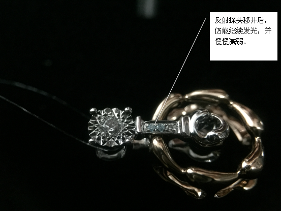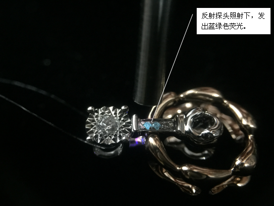 近期在使用紫外-可見光纖光譜儀對樣品進行日常鑒定的過程中,發(fā)現(xiàn)配鑲的厘石碎鉆中有兩顆的熒光極強。而且,當反射探頭離開樣品的時候,出現(xiàn)了明顯的磷光現(xiàn)象,這點非常符合無色HPHT合成鉆石的特征。通過近一步的檢測確認這兩粒配石就是HPHT合成鉆石。